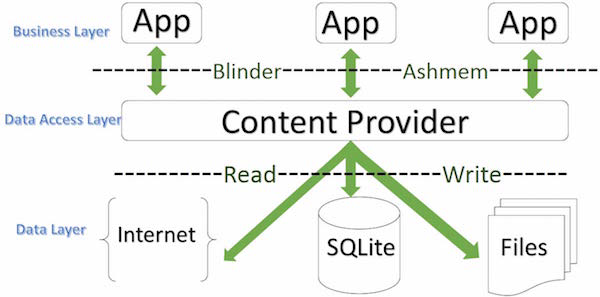 内容提供者可以让内容集中,必要时可以有多个不同的应用程序来访问。内容提供者的行为和数据库很像。你可以查询,编辑它的内容,使用 insert(), update(), delete() 和 query() 来添加或者删除内容。多数情况下数据被存储在 SQLite 数据库。