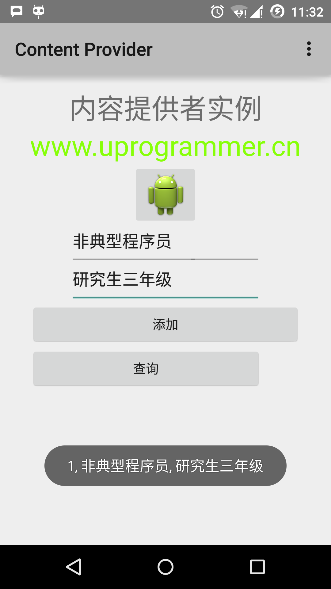 一旦你完成数据库记录的添加,是时候向内容提供者要求给回这些记录。点击"查询"按钮,这将通过实现的 query() 方法来获取并显示所有的数据记录。