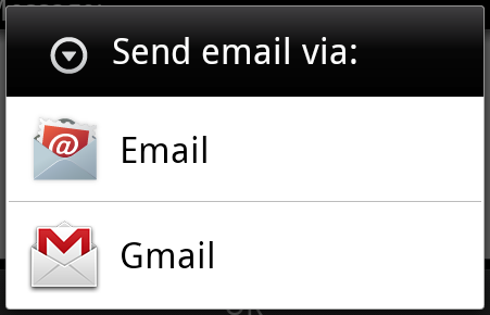 Intent email = new Intent(Intent.ACTION_SEND, Uri.parse("mailto:")); email.putExtra(Intent.EXTRA_EMAIL, recipients); email.putExtra(Intent.EXTRA_SUBJECT, subject.getText().toString()); email.putExtra(Intent.EXTRA_TEXT, body.getText().toString()); startActivity(Intent.createChooser(email, "Choose an email client from..."));