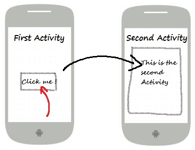 显式意图用于连接应用程序的内部世界,假设你需要连接一个活动到另外一个活动,我们可以通过显示意图,下图显示通过点击按钮连接第一个活动到第二个活动。