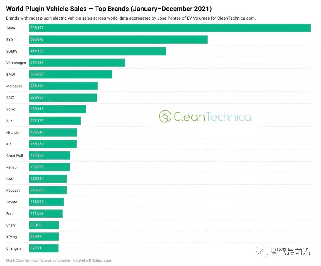 CleanTechnica:2021年全球新能源汽车销量榜单:特斯拉居首 比亚迪第二