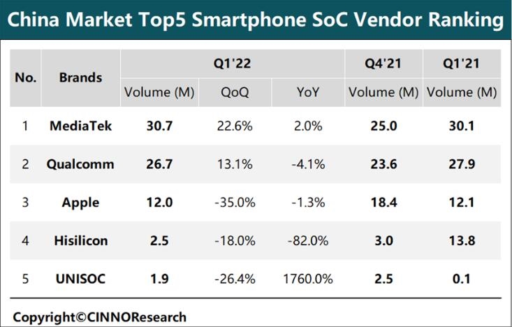 CINNO:2022年Q1中国智能手机SoC市场份额排行:联发科稳坐第一