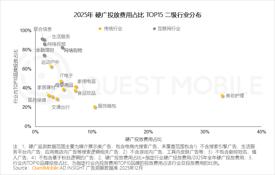 从硬广投放费用占比看,美妆护理行业持续断层式领先;综合行业内TOP10品牌集中度看,传统行业呈现大体量、低集中度的投放特征,中小及新锐品牌仍拥有活跃与突围空间;而互联网行业则表现出极高的集中态势,头部效应显著。