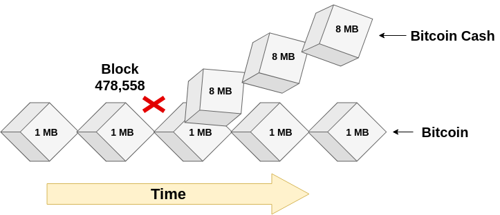 号区块,有一个分裂。ViaBTC池产生了一个1.9 MB的块,这在传统的比特币网络上无效,因为比特币有1MB的限制。这个新块没有1 MB的限制,但是它包括1.9MB。这导致了分裂,导致比特币现金的创建。正在挖掘比特币现金的计算机有一个协议,将块大小限制在8MB而不是1MB。