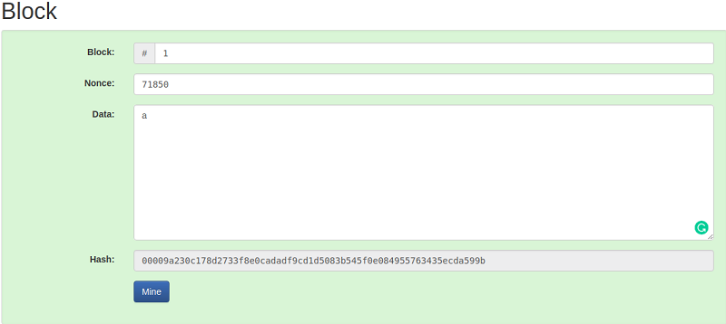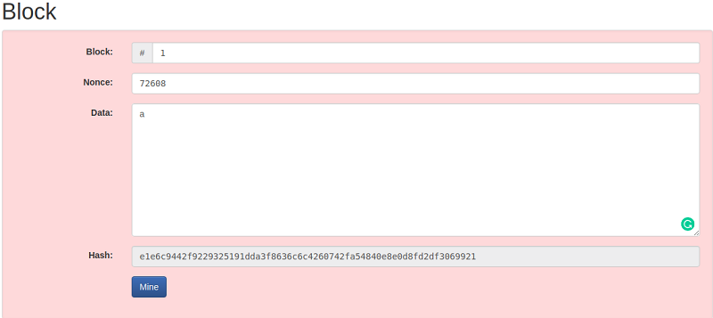 在Anders Brownworth哈希程序中,当点击图像中所示的mine按钮时,它将给出有效的块。这个块有一个唯一的nonce,哈希在开头有四个零。