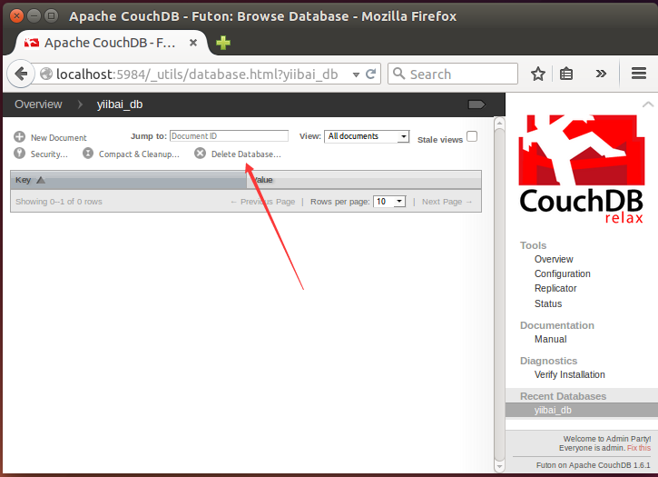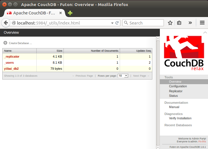 打开Fauxton网址:http://localhost:5984/_utils/ ,如下图所示 -