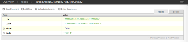 您可以删除任何字段(除了_id和_rev字段外),添加新字段,或更改现有字段的值。 在这个例子中,已经将done字段的值从false更改为true,如下所示: