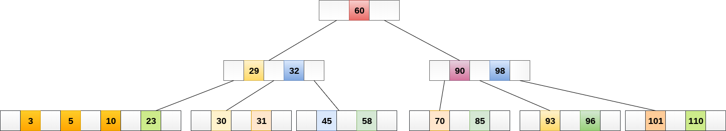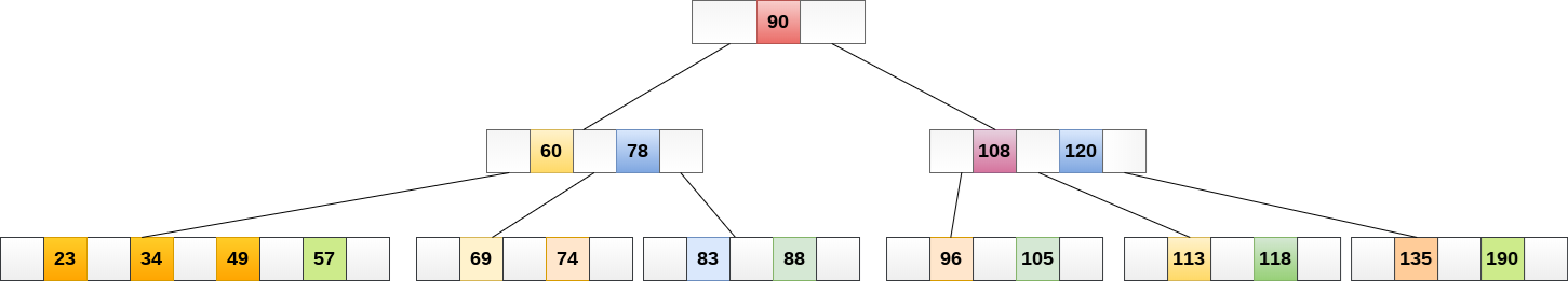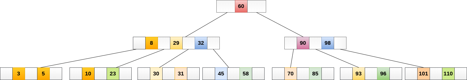 个键和M个子树。 使用B树的主要原因之一是它能够在单个节点中存储大量键,并且通过保持树的高度相对较小来存储大键值。