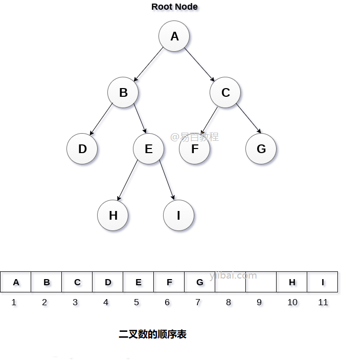 在这种表示方式中,数组用于存储树元素。 数组的大小将等于树中存在的节点数。 树的根节点将出现在数组的第一个索引处。 如果节点存储在第i