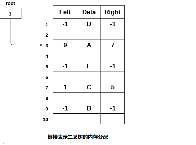 在这种表示中,二叉树以链表的形式存储在存储器中,其节点的数量存储在非连续的存储器位置并通过像树一样继承父子关系而链接在一起。 每个节点包含三个部分:指向左节点的指针,数据元素和指向右节点的指针。 每个二叉树都有一个根指针,指向二叉树的根节点。 在空二进制树中,根指针将指向null