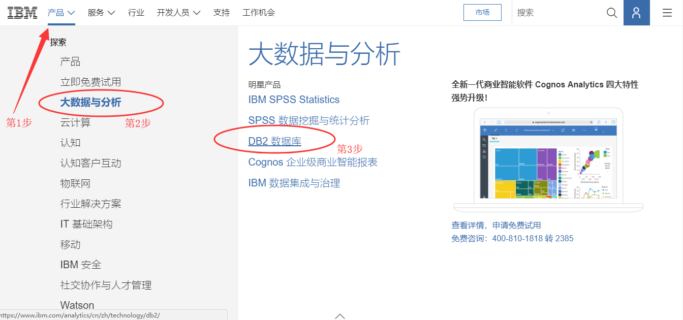 首先访问IBM网站:www.ibm.com ,从菜单:产品 -> 大数据与分析 -> Db2数据勯 ,并选择相应版本下载。如下图所示: