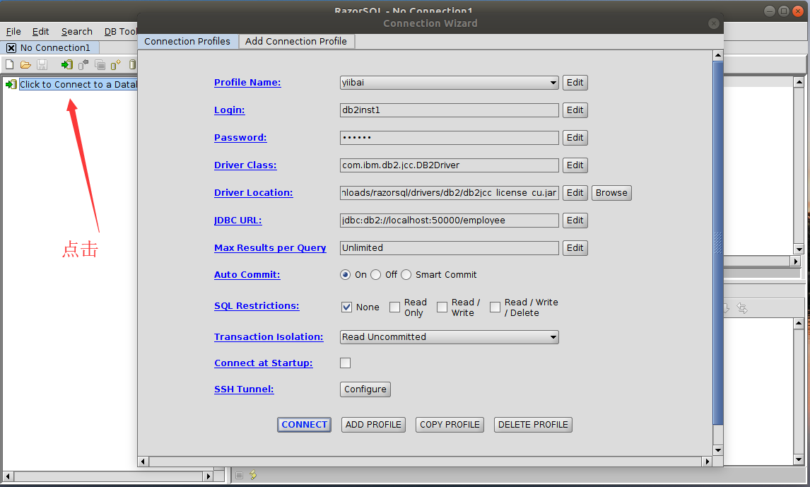 然后点击左上方 “Click to Connect to a Database”,在弹出的界面中输入配置信息,如下所示: