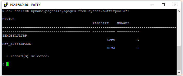 在创建数据库时DB2自动创建了一个缓冲池,并在上面创建了一个缓冲池。 现在,可以在当前数据库中检查已创建的缓冲池。