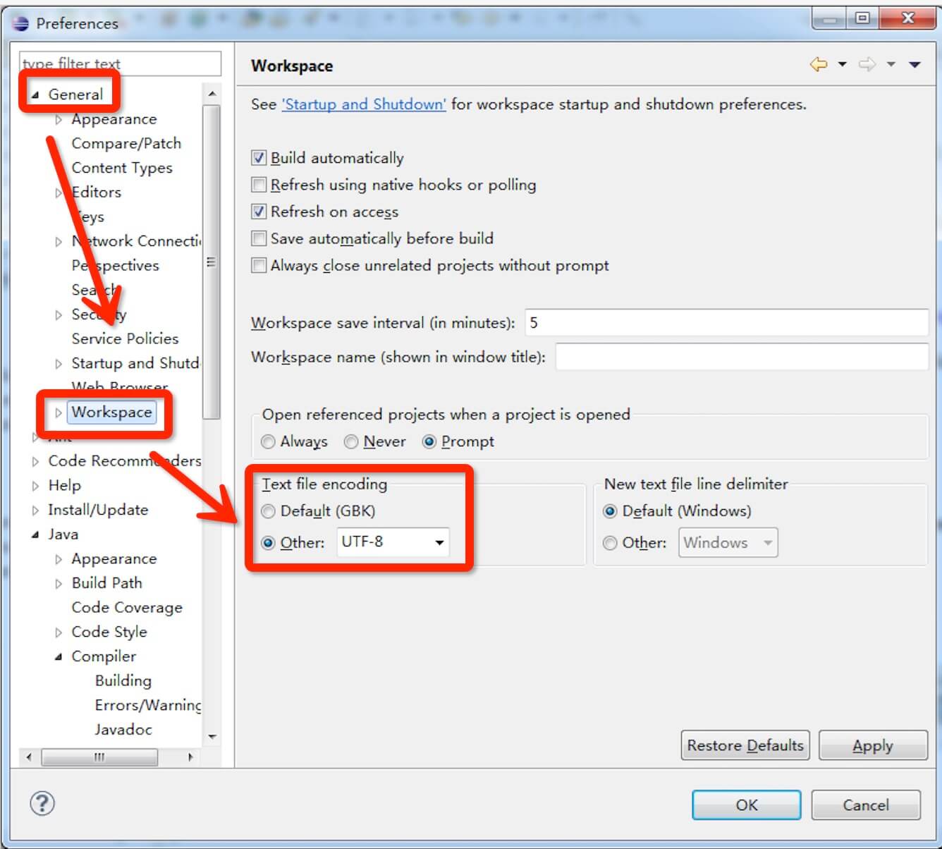 在菜单栏选择 Window -> Preferences -> General -> Workspace -> Text file encoding,在 Text file encoding 中点击 Other,选择 UTF-8,如图所示: