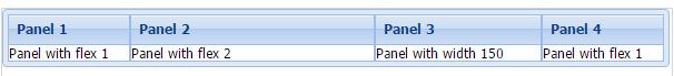 下面是一个简单的例子显示了hbox布局的用法<!DOCTYPE html> <html> <head> <link href="https://cdnjs.cloudflare.com/ajax/libs/extjs/6.0.0/classic/theme-classic/resources/theme-classic-all.css" rel="stylesheet" /> <script type="text/javascript" src="https://cdnjs.cloudflare.com/ajax/libs/extjs/6.0.0/ext-all.js"></script> <script type="text/javascript"> Ext.onReady(function() { Ext.create('Ext.panel.Panel', { renderTo : Ext.getBody(), layout : { type :'hbox' }, requires: ['Ext.layout.container.HBox'], xtype: 'layout-horizontal-box', width : 600, frame :true, items : [{ title: 'Panel 1', html : 'Panel with flex 1', flex : 1 },{ title: 'Panel 2', html : 'Panel with flex 2', flex : 2 },{ title: 'Panel 3', width: 150, html : 'Panel with width 150' },{ title: 'Panel 4', html : 'Panel with flex 1', flex : 1 }] }); }); </script> </head> <body> </body> </html>