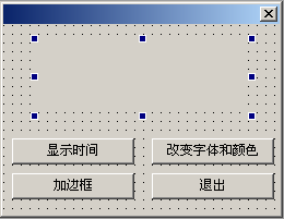 程序的功能:单击“显示时间”按钮时,将在标签中显示当前的时间,单击“改变字体和颜色”按钮时,标签中显示的内容的字体改为隶书、字号大小为12,并将标签的背景颜色设置为蓝色、前景颜色(文字的颜色)设置为黄色,单击“加边框”按钮时,将给标签加上立体边框,单击“退出”按钮时结束程序的执行。