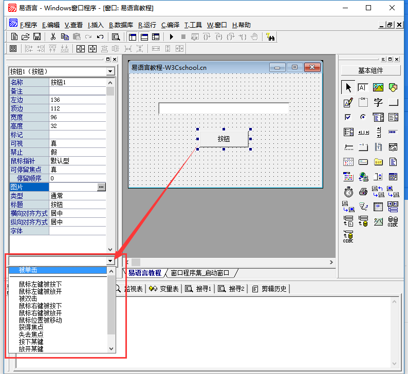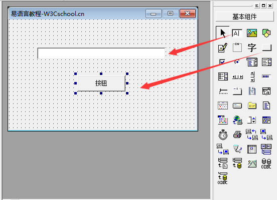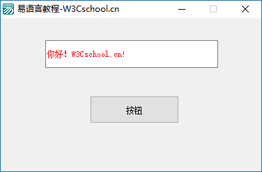 这节教程我们要实现一个简单的交互程序,在组件窗口中拖一个按钮组件到启动窗口中,当点击按钮时编辑框输出“你好!W3Cschool.cn!”。效果如图: