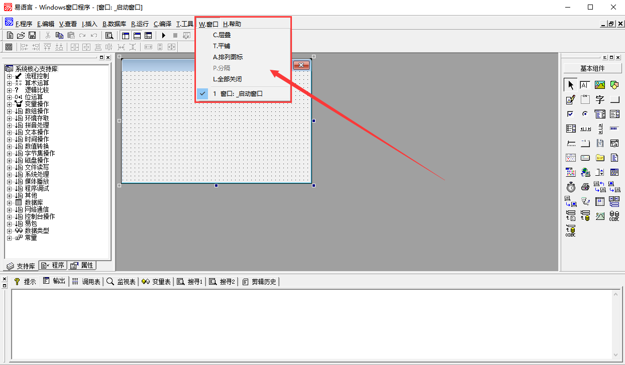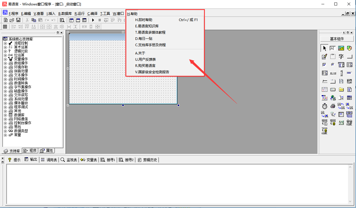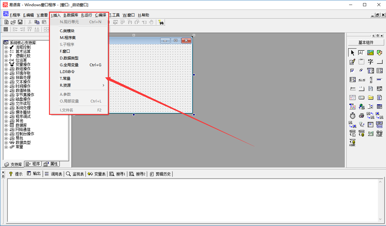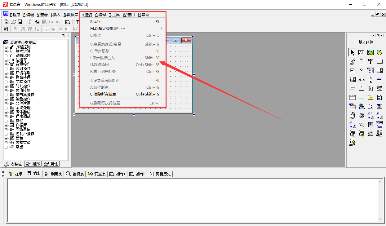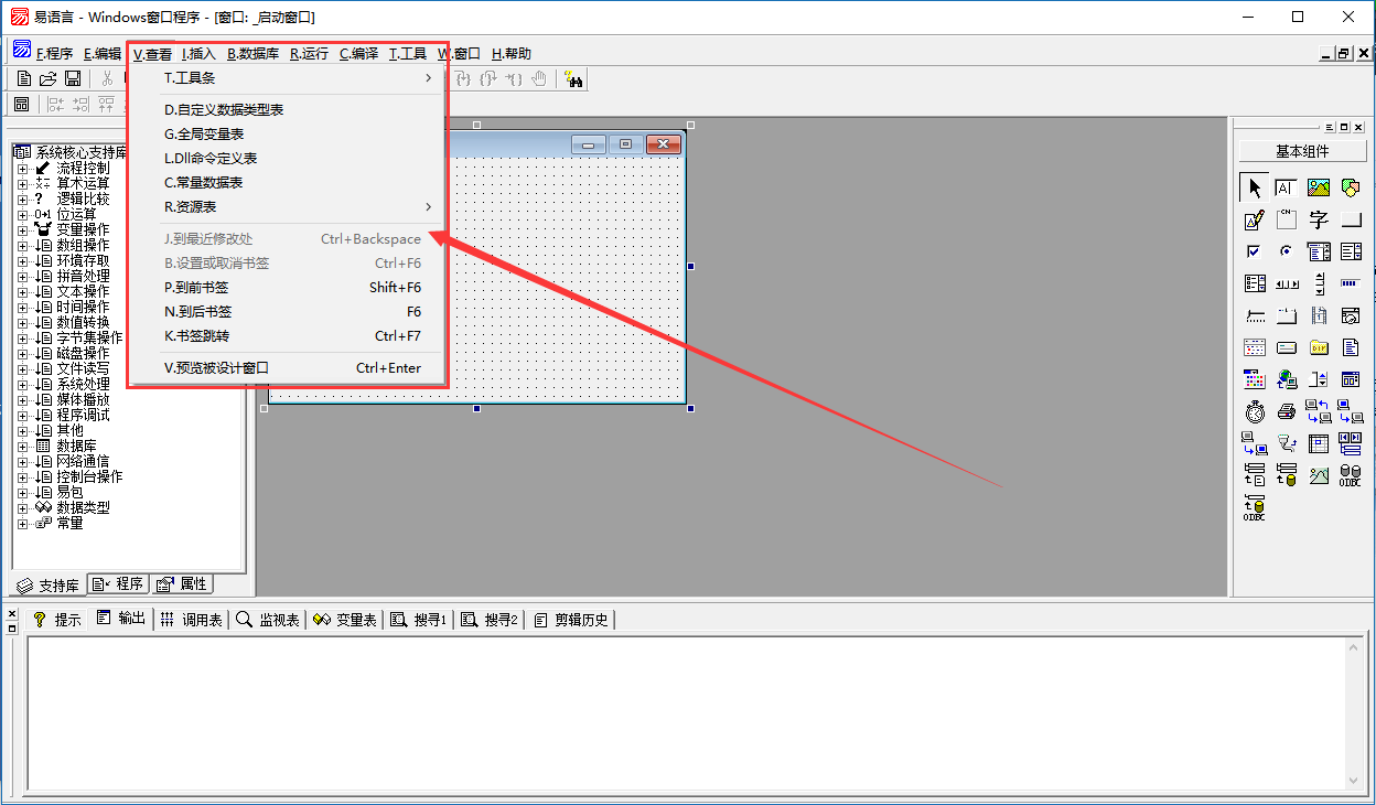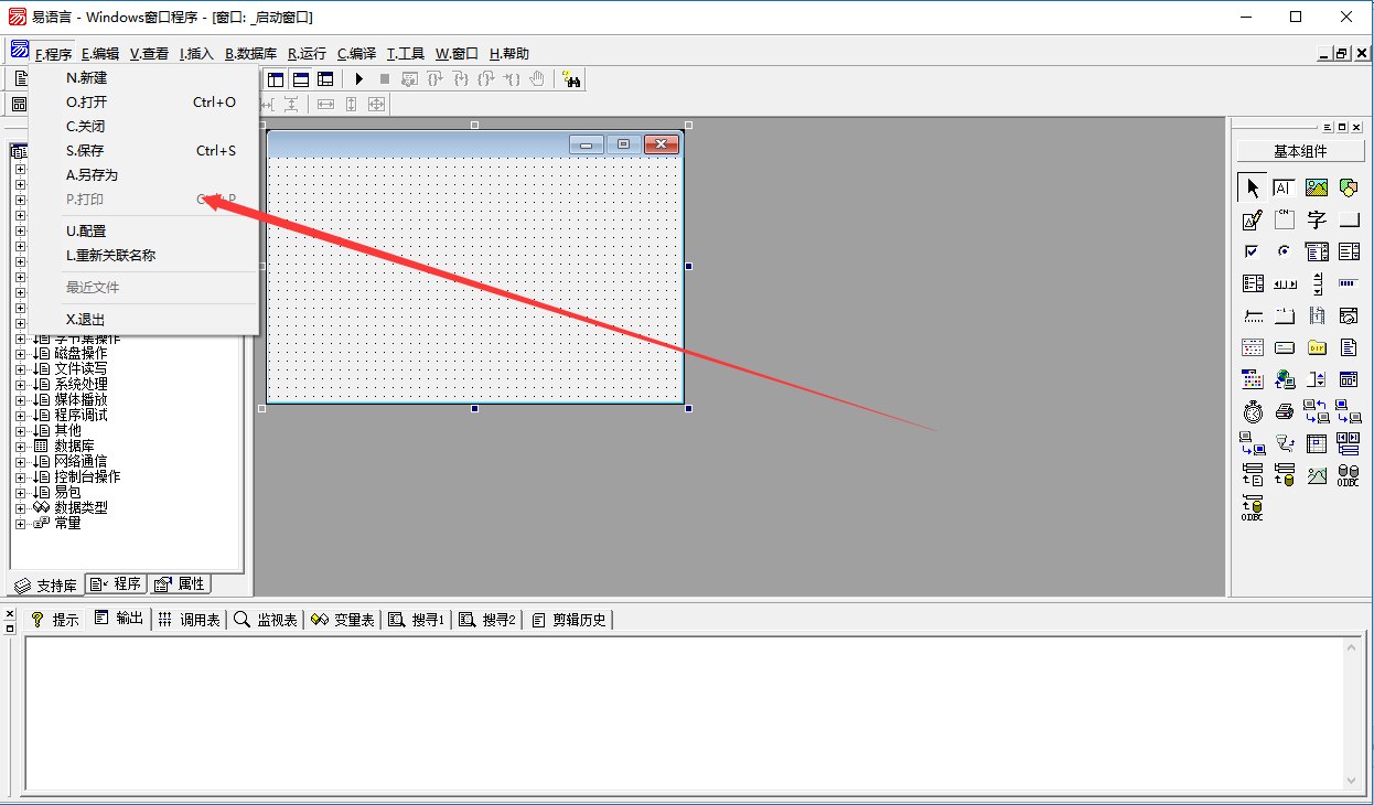 相当于其他应用程序的“文件”菜单,这个菜单主要负责文件操作,例如“新建”、“打开”、“保存”、“另存为”等等,还包括“程序配置”、“易模块管理”等。值得初学者注意的是,在易语言的“程序”菜单中还包括“编译独立发布版本”的菜单项。通过这个菜单命令,用户可以把编制好的程序打包成exe可执行文件。
