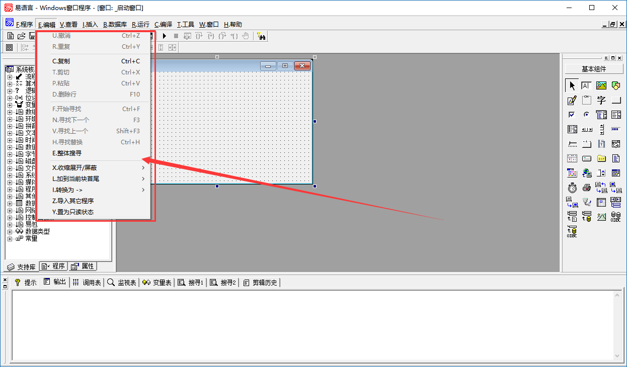 和其他应用程序的编辑菜单一样,这个菜单集成了所有的文本编辑命令,例如“剪切”、“复制”、“粘贴”、“查找”等,还包括“菜单编辑器”,用来编制程序的菜单。“编辑”菜单主要是针对代码编辑窗口而言的。