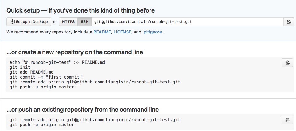 $ mkdir runoob-git-test # 创建测试目录 $ cd runoob-git-test/ # 进入测试目录 $ echo "# 外唐教程网 Git 测试" >> README.md # 创建 README.md 文件并写入内容 $ ls # 查看目录下的文件 README $ git init # 初始化 $ git add README.md # 添加文件 $ git commit -m "添加 README.md 文件" # 提交并备注信息 [master (root-commit) 0205aab] 添加 README.md 文件 1 file changed, 1 insertion(+) create mode 100644 README.md # 提交到 Github $ git remote add origin git@github.com:tianqixin/runoob-git-test.git $ git push -u origin master
