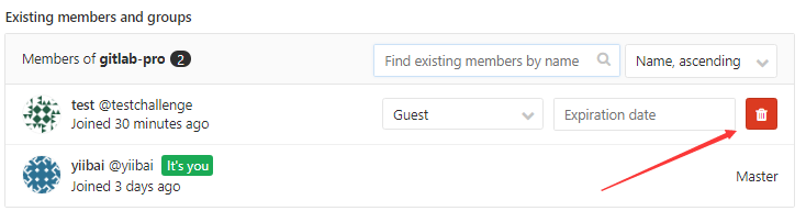 步骤(3): 您将看到“Existing members and groups”部分下的用户列表,并单击右侧的删除选项以从项目中删除用户: