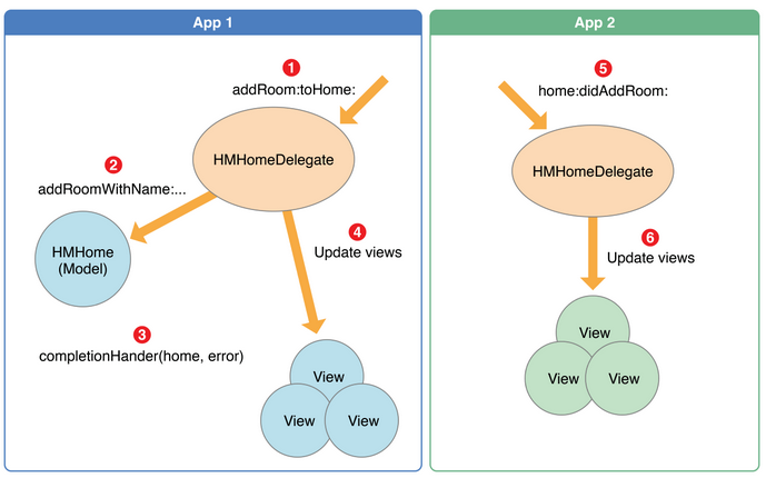例如,下图演示了使用代理方法的过程:响应用户的操作,你的应用程序调用了 addRoomWithName:completionHandler:方法,并且没有错误发生,完成处理程序应当更新 home 的所有视图。如果成功了,homeKit 将会发送 home:didAddRoom:消息给其他应用中 homes 的代理。因此,你实现的这个 home:didAddRoom:方法也应该更新 home 的所有视图。