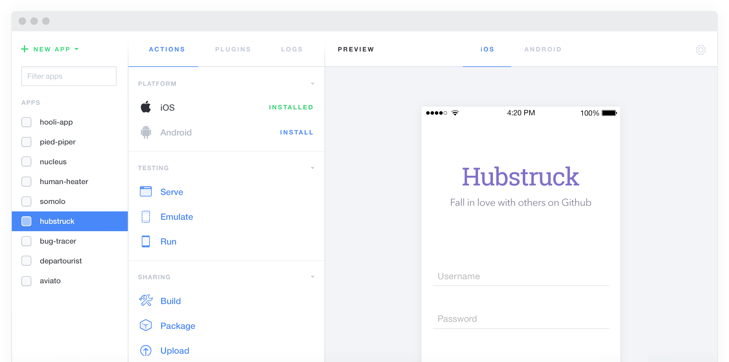 使用 ionic tool 创建,测试,运行你的apps(或者通过Cordova直接创建)。