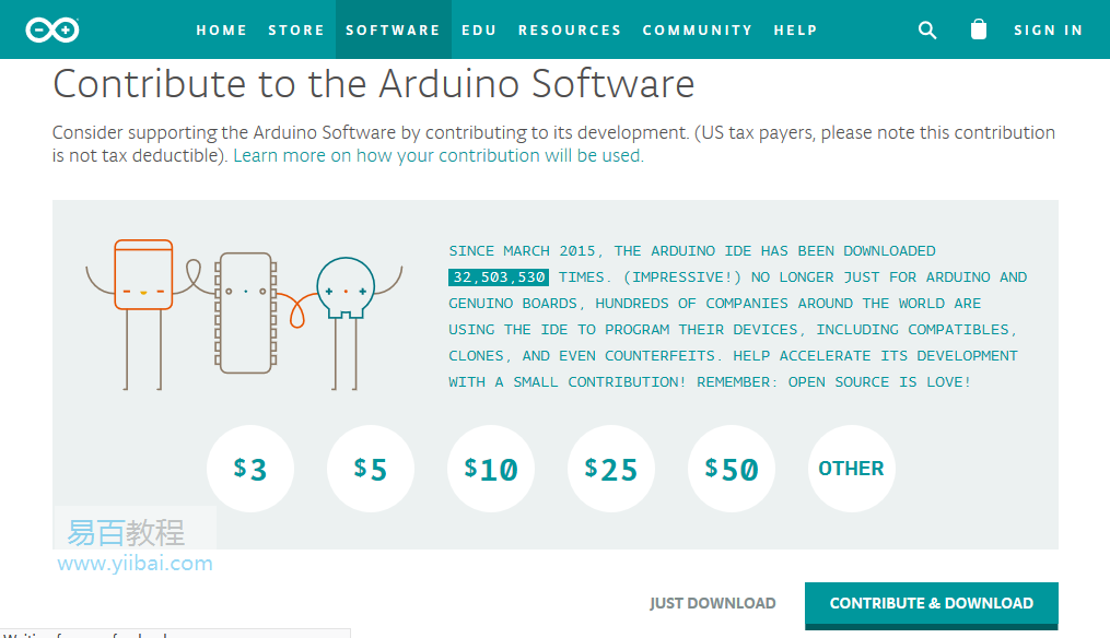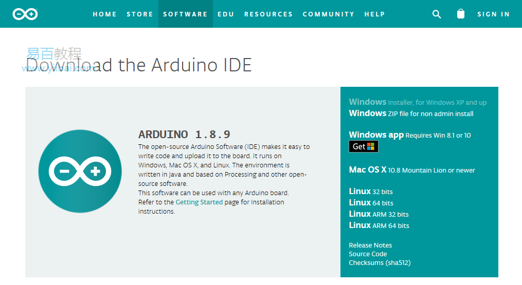 要进行Arduino板的编程,需要下载Arduino软件。可以从Arduino官方网站: https://www.arduino.cc/ 下载。如下图所示: