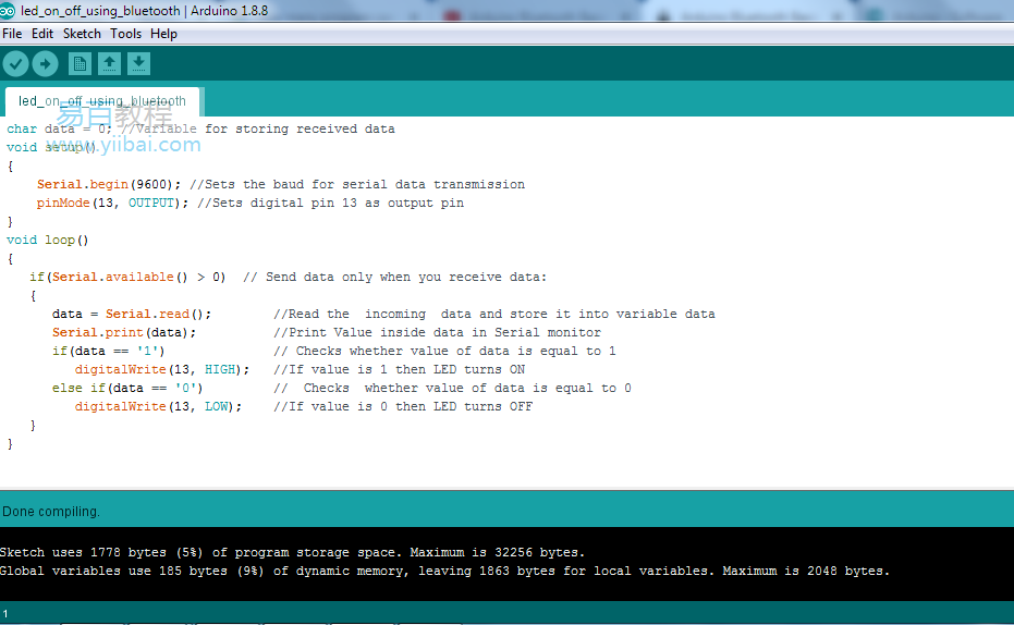 发送到蓝牙模块,此数据从蓝牙模块传输到Arduino,并关闭LED。