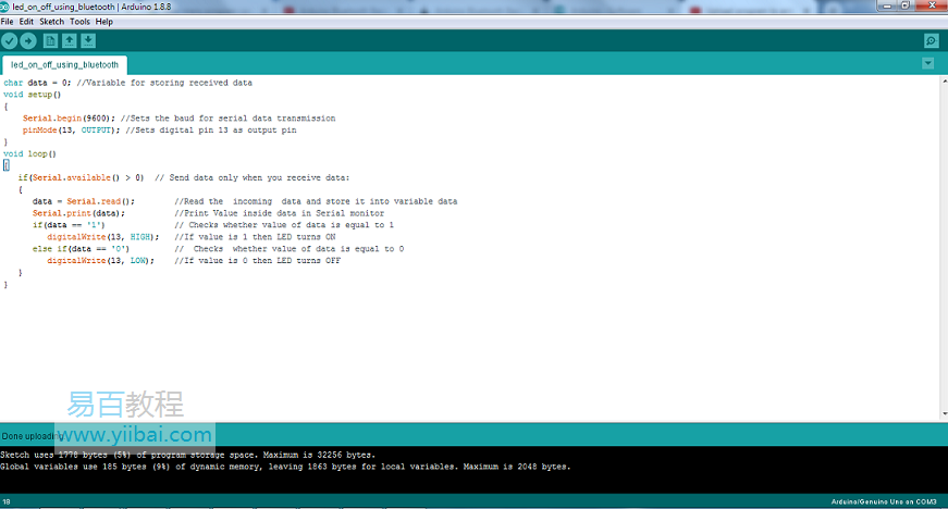通过Arduino UNO USB线将Arduino设备连接到笔记本电脑(或显示器)。在Arduino UNO上传程序时,删除Arduino UNO设备(如蓝牙模块和LED)的所有其他连接。