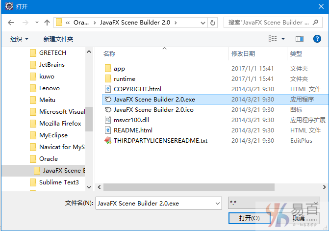 可执行文件位置(也就是JavaFX Scene Builder的安装目录下),在这个示例中安装的位置是: D:Program Files (x86)OracleJavaFX Scene Builder 2.0JavaFX Scene Builder 2.0.exe