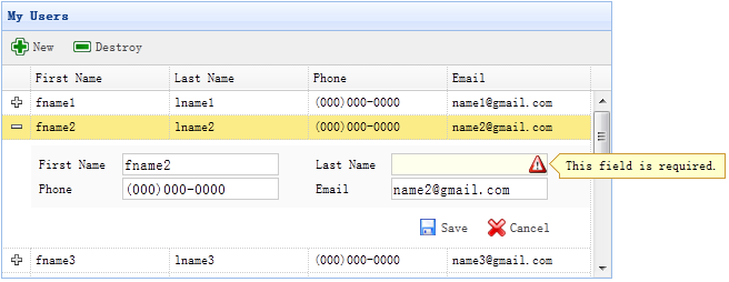 当切换数据网格视图(datagrid view)到 'detailview',用户可以展开一行来显示一些行的明细在行下面。这个功能允许您为防止在明细行面板(panel)中的编辑表单(form)提供一些合适的布局(layout)。在本教程中,我们使用数据网格(datagrid)组件来减小编辑表单(form)所占据空间。