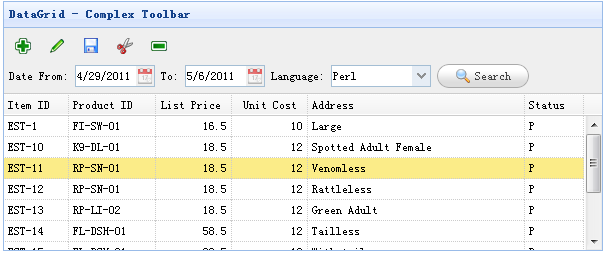 数据网格(datagrid)的工具栏(toolbar)可以包含按钮及其他组件。 您可以通个一个已存在的 DIV 标签来简单地定义工具栏布局,该 DIV 标签将成为数据网格(datagrid)工具栏的内容。 本教程将向您展示如何创建数据网格(datagrid)组件的复杂工具栏。