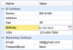 {"total":4,"rows":[ {"name":"Name","value":"Bill Smith","group":"ID Settings","editor":"text"}, {"name":"Address","value":"","group":"ID Settings","editor":"text"}, {"name":"SSN","value":"123-456-7890","group":"ID Settings","editor":"text"}, {"name":"Email","value":"bill@gmail.com","group":"Marketing Settings","editor":{ "type":"validatebox", "options":{ "validType":"email" } }} ]}