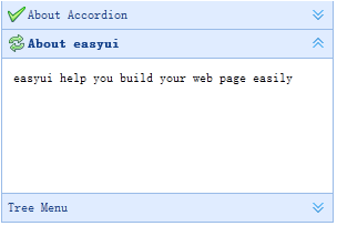<div id="aa" class="easyui-accordion" style="width:300px;height:200px;"> <div title="Title1" data-options="iconCls:'icon-save'" style="overflow:auto;padding:10px;"> <h3 style="color:#0099FF;">Accordion for jQuery</h3> <p>Accordion is a part of easyui framework for jQuery. It lets you define your accordion component on web page more easily.</p> </div> <div title="Title2" data-options="iconCls:'icon-reload',selected:true" style="padding:10px;"> content2 </div> <div title="Title3"> content3 </div> </div>