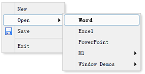 <div id="mm" class="easyui-menu" style="width:120px;"> <div>New</div> <div> <span>Open</span> <div style="width:150px;"> <div><b>Word</b></div> <div>Excel</div> <div>PowerPoint</div> </div> </div> <div data-options="iconCls:'icon-save'">Save</div> <div class="menu-sep"></div> <div>Exit</div> </div>