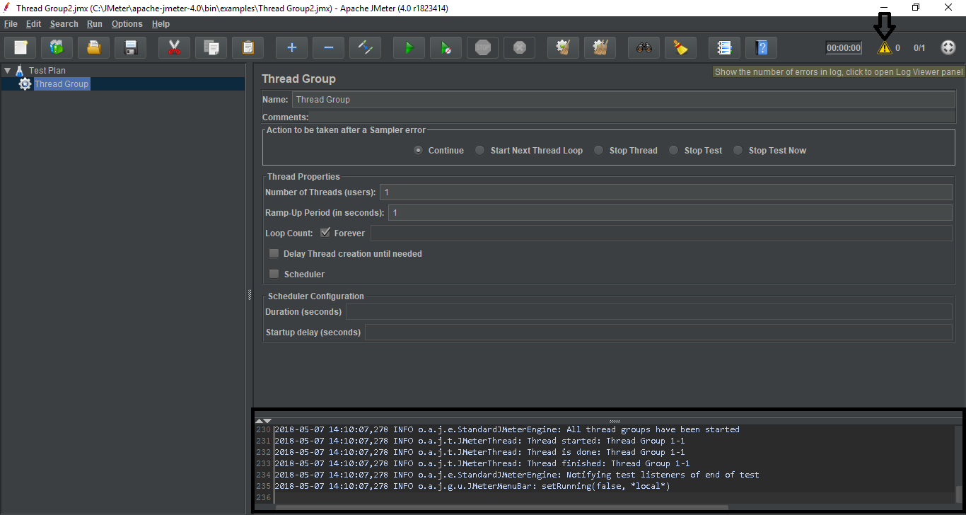 您可以通过单击菜单栏正下方部分右侧的惊叹号来访问JMeter日志。