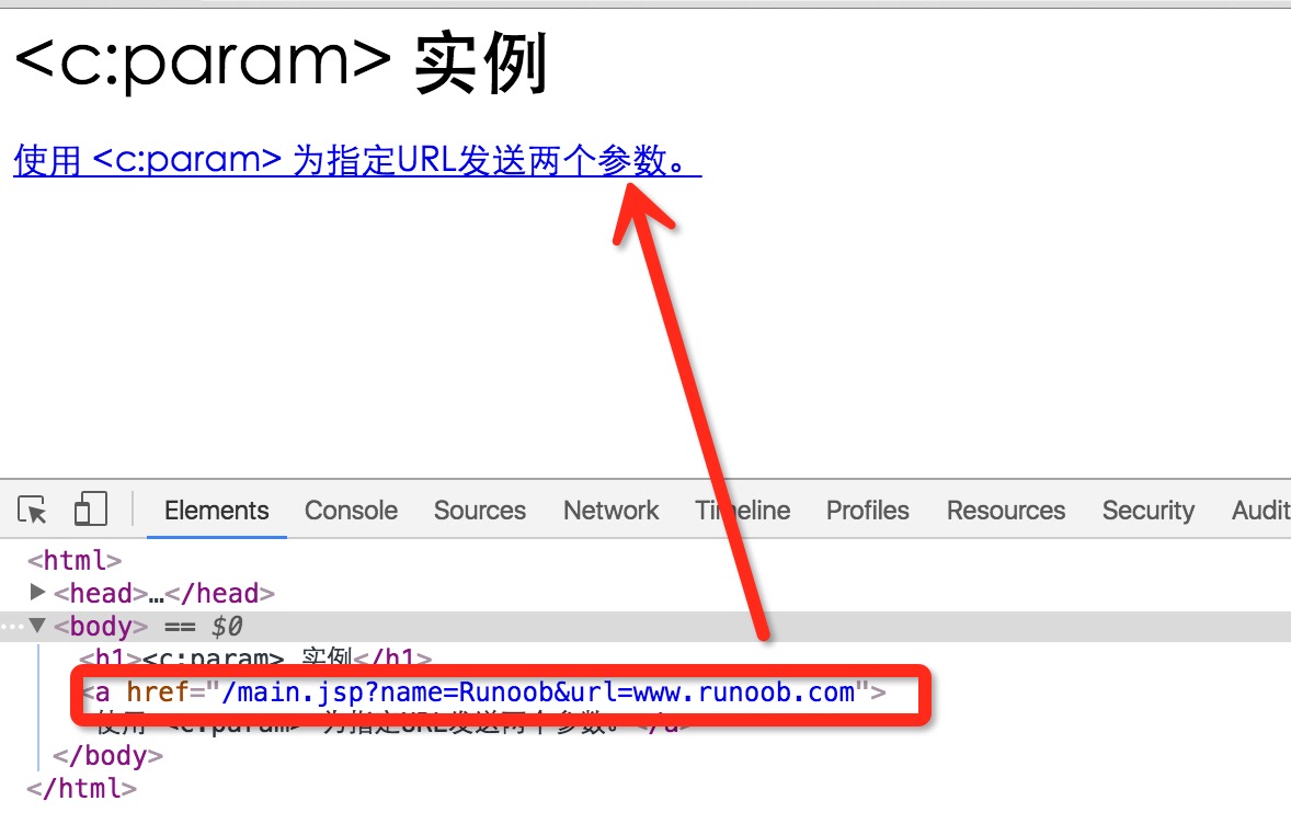 <%@ page language="java" contentType="text/html; charset=UTF-8" pageEncoding="UTF-8"%> <%@ taglib uri="http://java.sun.com/jsp/jstl/core" prefix="c" %> <html> <head> <title>c:forTokens 标签实例</title> </head> <body> <h1><c:param> 实例</h1> <c:url var="myURL" value="main.jsp"> <c:param name="name" value="Runoob"/> <c:param name="url" value="www.waitang.com"/> </c:url> <a href="/<c:out value="${myURL}"/>"> 使用 <c:param> 为指定URL发送两个参数。</a> </body> </html>