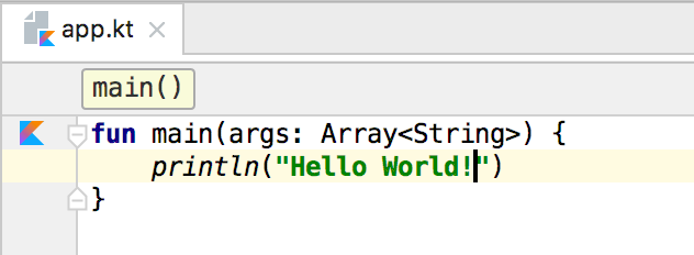 接下来,我们在 app.kt 文件中写点代码。IntelliJ IDEA 为我们提供了一个快速完成此操作的模板,只需键入 main 然后按 Tab 即可。