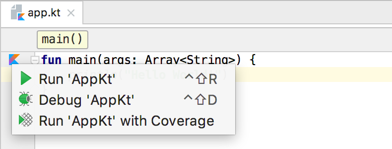 接下来我们可以鼠标点击编辑器右上角 kotlin图标并选择 Run 'AppKt'来运行代码:
