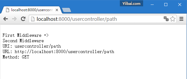 <?php namespace AppHttpControllers; use IlluminateHttpRequest; use AppHttpRequests; use AppHttpControllersController; class UserController extends Controller { public function __construct(){ $this->middleware('Second'); } public function showPath(Request $request){ $uri = $request->path(); echo '<br>URI: '.$uri; $url = $request->url(); echo '<br>'; echo 'URL: '.$url; $method = $request->method(); echo '<br>'; echo 'Method: '.$method; } }