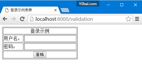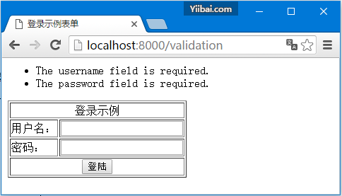<html> <head> <title>登录示例表单</title> </head> <body> @if (count($errors) > 0) <div class = "alert alert-danger"> <ul> @foreach ($errors->all() as $error) <li>{{ $error }}</li> @endforeach </ul> </div> @endif <?php echo Form::open(array('url'=>'/validation')); ?> <table border = '1'> <tr> <td align = 'center' colspan = '2'>登录示例</td> </tr> <tr> <td>用户名:</td> <td><?php echo Form::text('username'); ?></td> </tr> <tr> <td>密码:</td> <td><?php echo Form::password('password'); ?></td> </tr> <tr> <td align = 'center' colspan = '2'> <?php echo Form::submit('登陆'); ? ></td> </tr> </table> <?php echo Form::close(); ?> </body> </html>