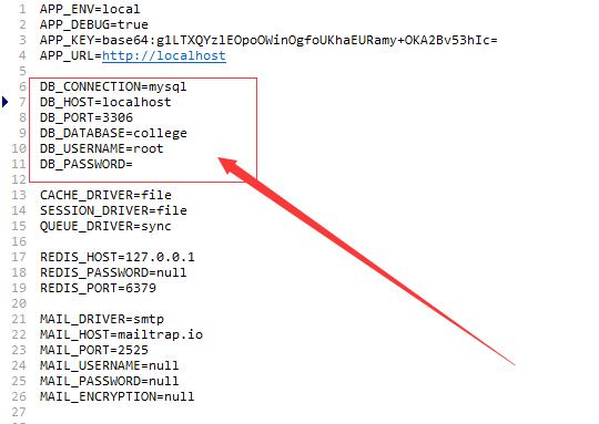 PDOException in Connector.php line 55:SQLSTATE[HY000] [1045] Access denied for user 'homestead'@'localhost' (using password: YES)则需要配置 D:laravel.env 文件,如下: