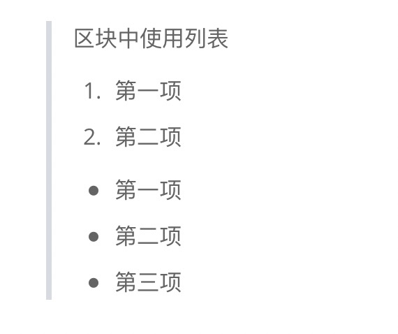 > 区块中使用列表 > 1. 第一项 > 2. 第二项 > + 第一项 > + 第二项 > + 第三项