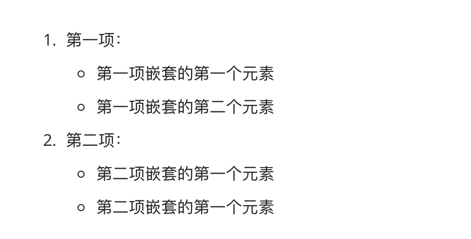 1. 第一项: - 第一项嵌套的第一个元素 - 第一项嵌套的第二个元素 2. 第二项: - 第二项嵌套的第一个元素 - 第二项嵌套的第一个元素
