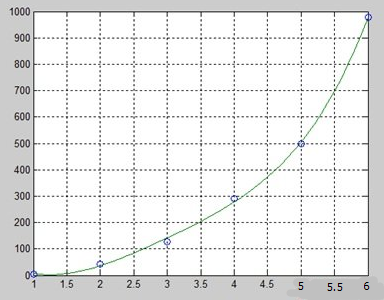 x = [1 2 3 4 5 6]; y = [5.5 43.1 128 290.7 498.4 978.67]; %data p = polyfit(x,y,4) %get the polynomial % Compute the values of the polyfit estimate over a finer range, % and plot the estimate over the real data values for comparison: x2 = 1:.1:6; y2 = polyval(p,x2); plot(x,y,'o',x2,y2) grid on