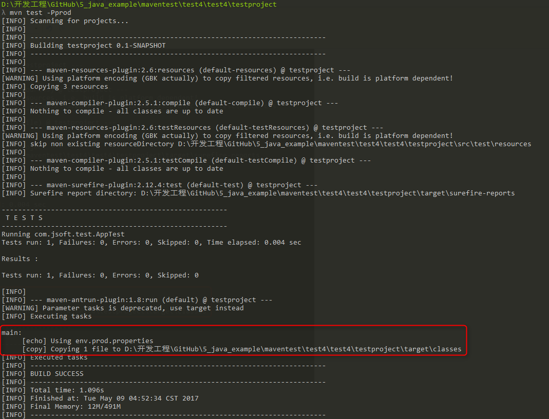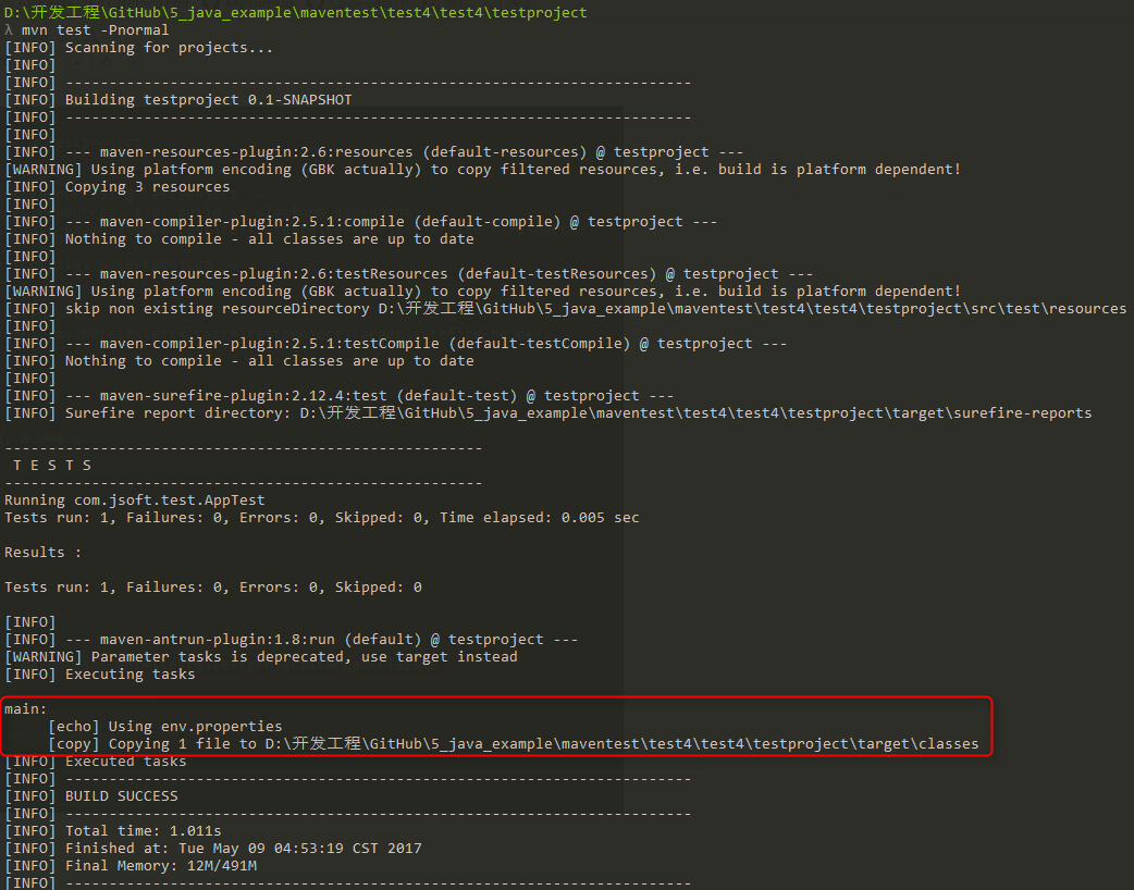 <copy file="src/main/resources/env.test.properties" tofile="${project.build.outputDirectory}/env.properties" overwrite="true"/>