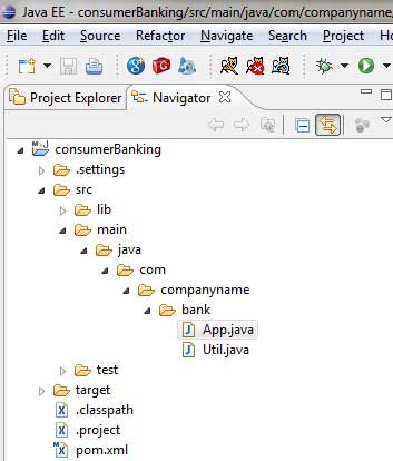 • 选择项目的路径,即使用 Maven 创建一个项目时的存储路径。假设我们创建了一个项目: consumerBanking. 通过 Maven 构建 Java 项目 查看如何使用 Maven 创建一个项目。