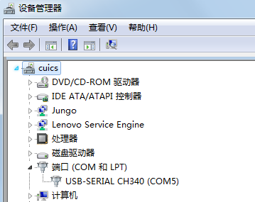 首先,我们要把硬件连接好,把板子插到我们的电脑上,打开设备管理器查看所使用的是哪个 COM 口,如图2-21所示,找到“USB-SERIAL CH340(COM5)”这一项,这里最后的数字就是开发板目前所使用的 COM 端口号。