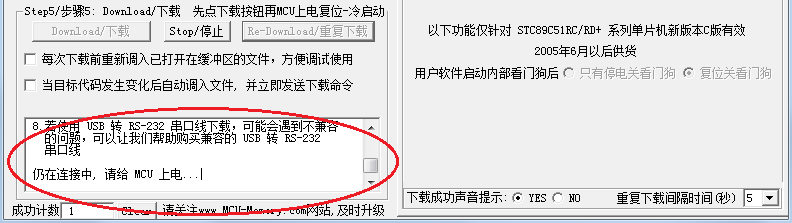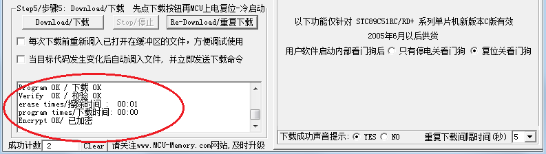 下载软件列出了5个步骤:第一步,选择单片机型号,我们现在用的单片机型号是STC89C52RC,这个一定不能选错了;第二步,点击“打开程序文件”,找到我们刚才建立工程的那个 lesson2 文件夹,找到 LED.hex 这个文件,点击打开;第三步,选择刚才查到的 COM 口,波特率使用默认的就行;第四步,这里的所有选项都使用默认设置,不要随便更改,有的选项改错了以后可能会产生麻烦。第五步,因为 STC 单片机要冷启动下载,就是先点下载,然后再给单片机上电,所以我们先关闭板子上的电源开关,然后点击“Download/下载”按钮,等待软件提示你请上电后,如图2-23所示,然后再按下板子的电源开关,就可以将程序下载到单片机里边了。当软件显示“已加密”就表示程序下载成功了,如图2-24所示。